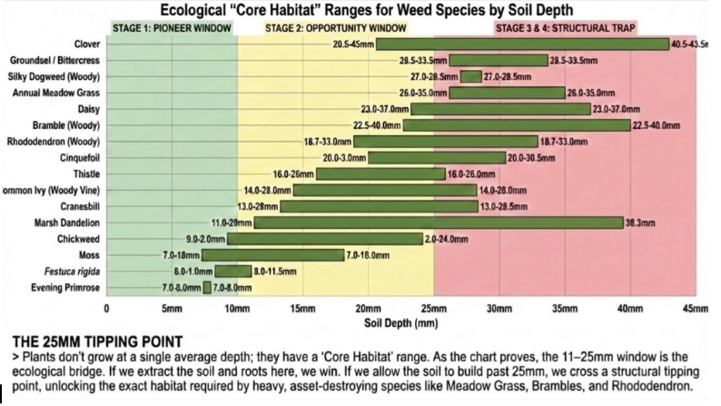 - Stage 4: Structural Failure (>25mm soil): Once soil builds past the 25mm tipping point, it unlocks the exact habitat required for heavy, asset-destroying perennials like annual meadow grass and woody brambles.